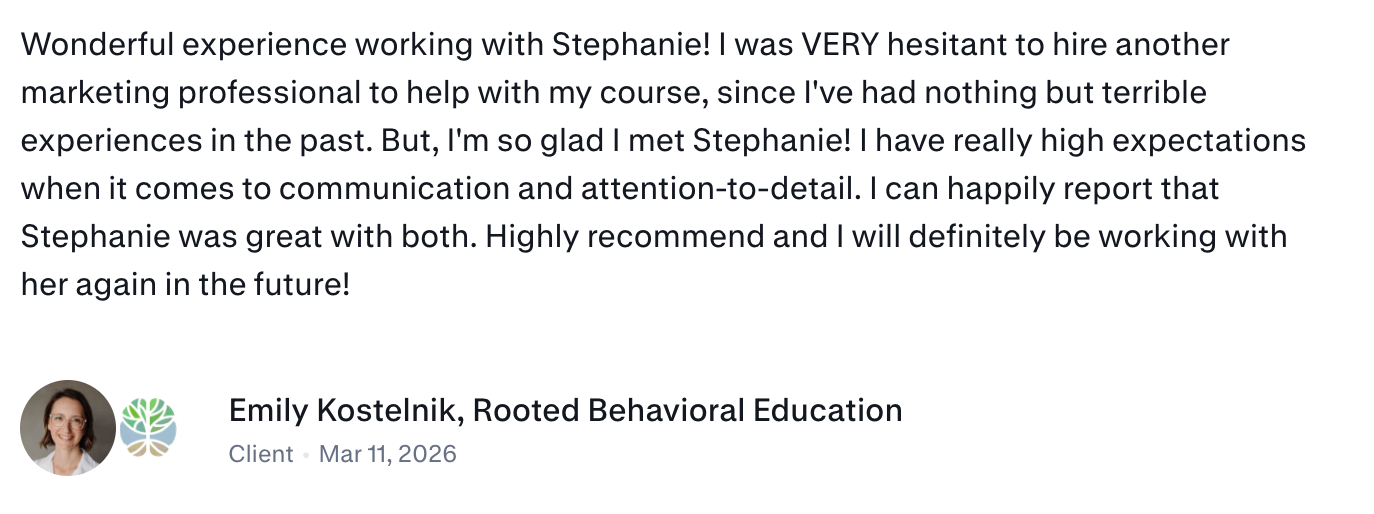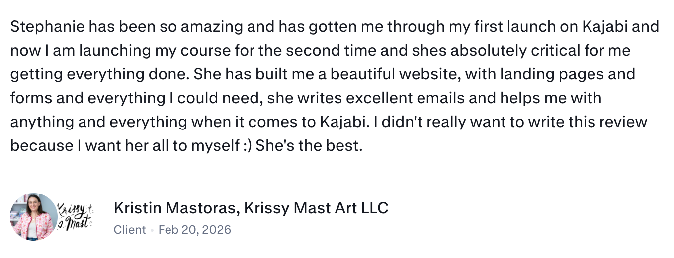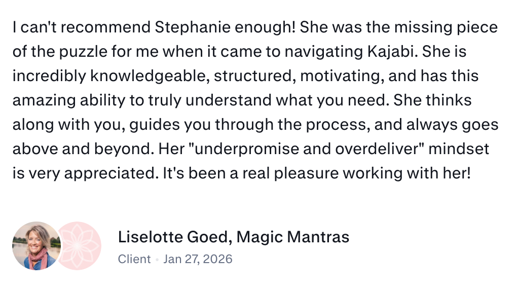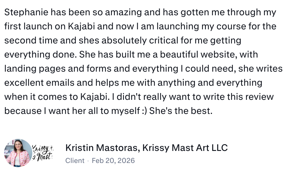 I hired Stephanie to help me launch my first digital course, in particular for the tech side of things. I got the sense straight away in our initial call that she is kind, committed, compassionate and very knowledgeable. I found it very easy to communicate with her and she was always quick to respond to my queries or suggestions. I found it quite fun to work with her (we had as good laugh at times) but at the same time she is extremely professional and efficient at what she does. She walked me step-by-step through the whole process of launching my course—uploading the course lessons, creating the sales page, setting up and monitoring the live webinars, creating all the pre and post-webinar email sequences. She also transferred my email list from Mailchimp to Kajabi and created a series of Loom instructional videos to help me use the new platform. She also changed all the lead magnet sign-up forms on my WP website to integrate with the new platform. Stephanie more than fulfilled my expectations. Her work was always delivered promptly (at times I was amazed how quickly!) extremely professionally and, as I said before, with good humour. Another thing I loved about working with Stephanie is her directness and her honesty. If she thinks something isn't a good idea, she'll tell you straight. :) If you are thinking of hiring Stephanie for your next project, go for it!! You'll be glad you did :)