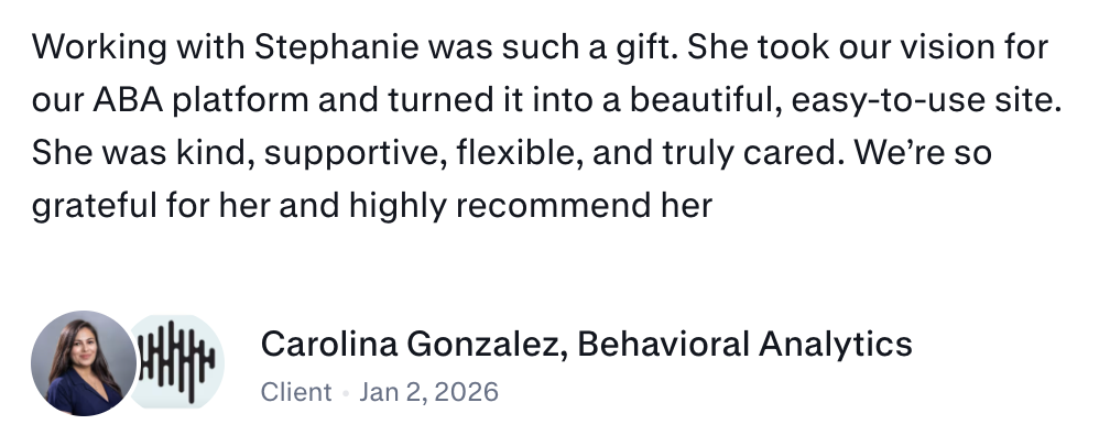 From the start, she made the entire process so easy. I didn’t have to worry about a thing—not even the copy for the website! Her detailed questionnaire captured exactly what I wanted, and she took care of everything from A to Z. I never had to chase her for updates; she was incredibly fast and efficient while staying on top of every detail. What really stood out was how quickly she understood my vision and brought it to life, going above and beyond to answer my questions—even on things that weren’t technically part of her role. She guided me step by step, and her support made all the difference. If you’re looking for someone who’s professional, talented, and genuinely cares about your project, I can’t recommend Stephanie enough!